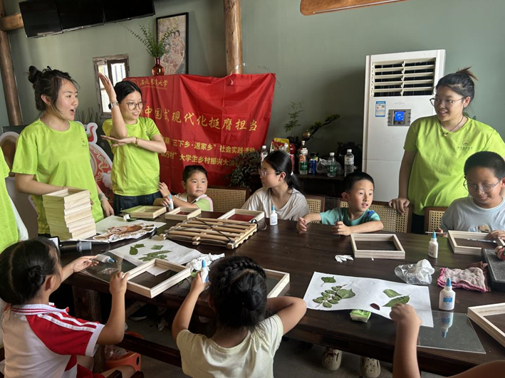 课前,队员们深入山林,采集本地特色植物样本,精心压制制作教学标本。课堂上,他们带领十余名留守儿童,利用这些标本开展“植物探秘”活动。孩子们在哥哥姐姐们的指导下,动手学习植物识别知识,体验植物拓印书签制作。“看,我的板栗叶拓印像把小扇子!”查雨欣小朋友兴奋地展示自己的作品。这堂别开生面的自然课,不仅激发了孩子们的科学兴趣和动手能力,更在寓教于乐中增强了他们对家乡生态文化的认同感和保护意识,悄然播下了“知农爱农”的种子。