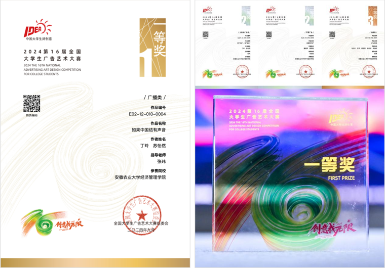 本届大广赛共收到来自全国29个赛区1873所高校报送的77万余组参赛作品,经过学校初评、赛区评选、全国总评审,yl6809永利检测中心学子在本届比赛中共获国家级一等奖1项,二等奖2项、三等奖1项、优秀奖1项,省级1等奖3项、二等奖6项、三等奖12项,取得了“质”和“量”的新突破。公司经济管理学院2021级经济学专业丁玲、yl6809永利检测中心2021级园林专业苏怡然同学共创的广播类作品《如果中国结有声音》荣获全国一等奖,yl6809永利检测中心艺术设计系张玮老师获评“优秀指导教师”称号。