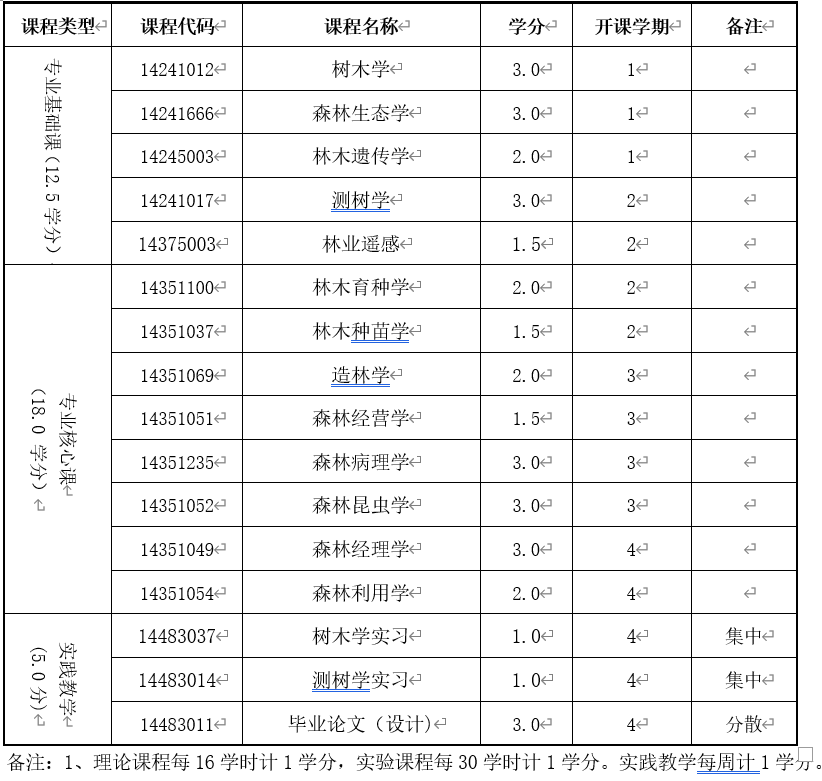 (五)主要课程:树木学、林木遗传学、测树学、林业遥感、林木育种学、林木种苗学、造林学、森林经营学、森林病理学、森林昆虫学、森林经理学、森林利用学等。