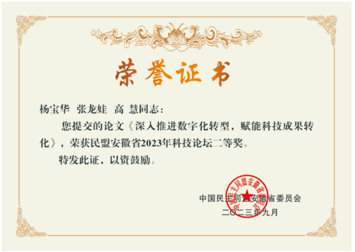 近日,由民盟安徽省委主办的“创新合作机制,促进科技成果转化”的科技论坛在蚌埠市召开,省政协副主席、民盟省委主委、中国科学院院士郑永飞出席论坛并讲话。公司民盟基层委员会杨宝华、张龙娃、高慧共同撰写的论文“深入推进数字化转型,赋能科技成果转化”,荣获科技论坛论文二等奖。会上,杨宝华作为获奖代表进行了交流分享。