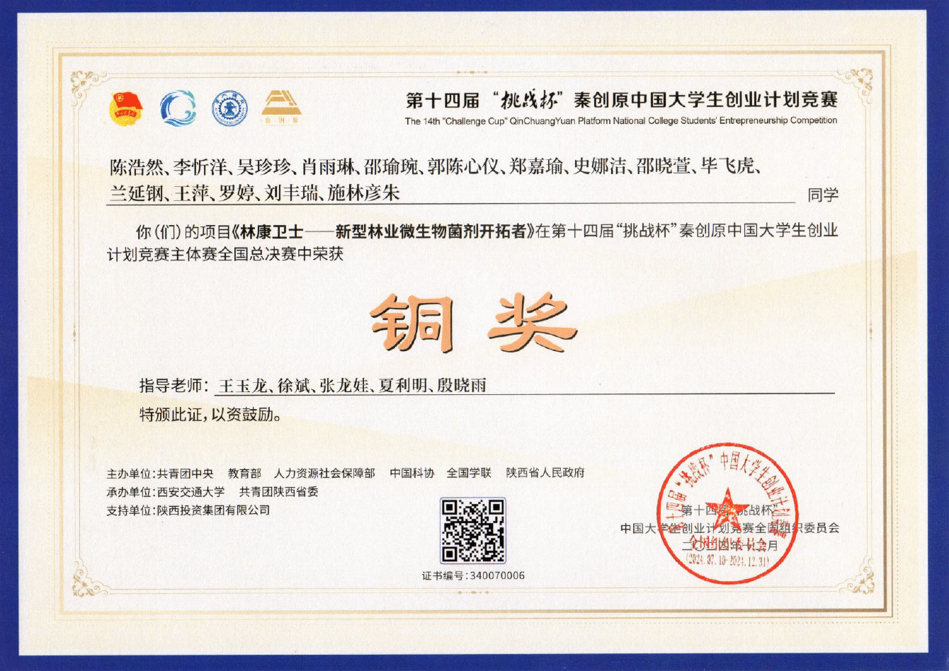 本网讯 近日,2024年第十四届“挑战杯”秦创原中国老员工创业计划竞赛获奖名单揭晓,公司王玉龙老师指导《林康卫士—新型林业微生物菌剂开拓者》在国家总决赛中荣获铜奖。