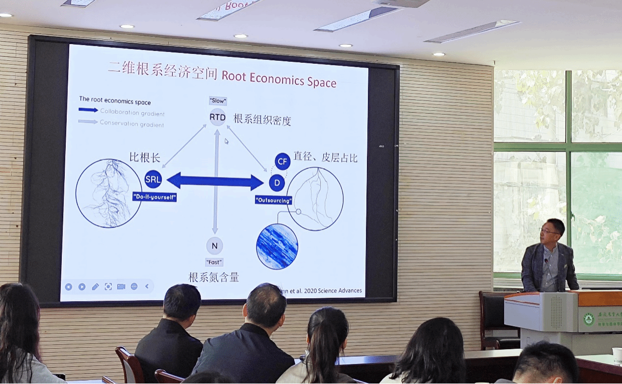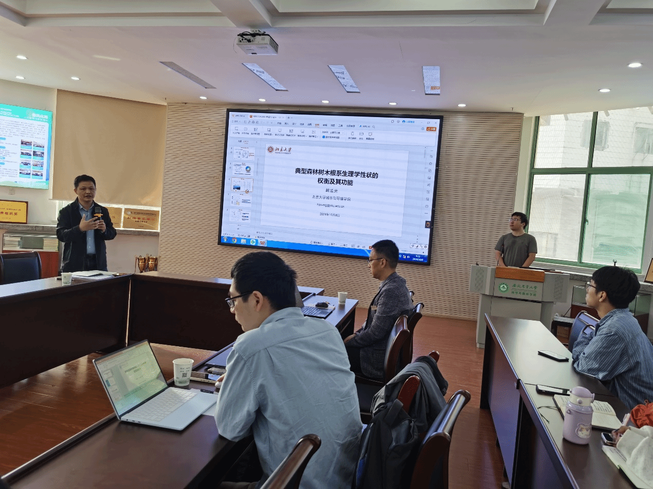 韩孟光博士后以“典型森林树木根系生理学性状的权衡及其功能”为题,介绍了根系功能性状的权衡、根系分泌物的生态学研究及根系性状与根际效应之间的关联规律。