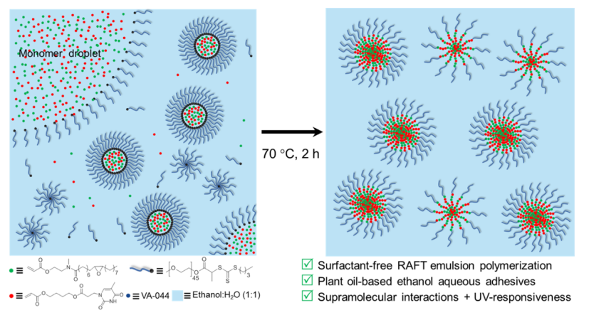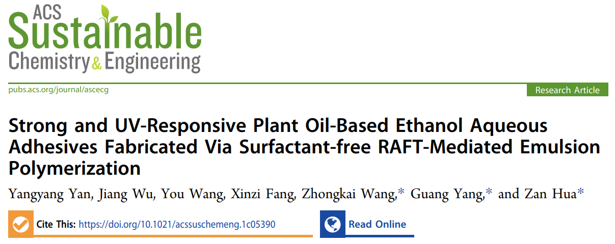 本网讯 近日,国际高水平期刊(中科院一区,IF =8.2)在线发表了林学院材料科学与工程系以及生物质分子工程中心华赞副教授题为“Strong and UV-Responsive Plant Oil-Based Ethanol Aqueous Adhesives Fabricated Via Surfactant-free RAFT-Mediated Emulsion Polymerization”的研究论文。该研究报到了利用无表面活性剂RAFT介导的乳液聚合制备植物油基水性胶粘剂,同时发现通过引入含胸腺嘧啶的单体可以极大的提高聚合物的黏附强度,并且在紫外下具有可调控的黏附性能。(https://doi.org/10.1021/acssuschemeng.1c05390)。