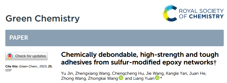 本网讯 近日,公司yl6809永利检测中心袁亮教授在化学及绿色可持续发展技术领域顶级期刊《绿色化学》(Green Chemistry ,IF=11.03,中科院一区Top期刊)发表了题为《基于硫磺改性环氧树脂的高强高韧可化学解胶合粘合剂》(Chemically Debondable, High-strength and Tough Adhesives from Sulfur Modified Epoxy Networks)的研究论文。团队以硫磺和林源蓖麻油分子作为原料,发展了一种无催化剂无溶剂的绿色环保路径获得了拉伸剪切强度高达31MPa的新型生物基粘合剂。其强度超过了商业的环氧粘合剂,不仅可以重复使用,还实现了粘结件的热诱导和化学诱导高效解胶合,促进粘结件的循环回收再利用。