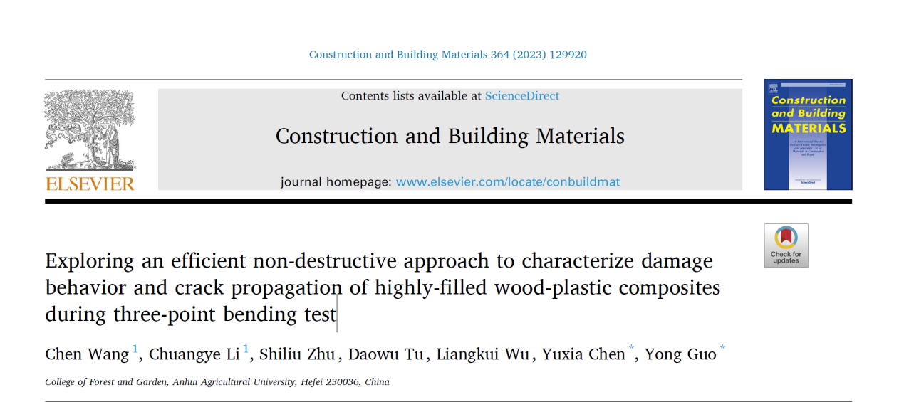 本网讯 近日,公司yl6809永利检测中心郭勇教授和陈玉霞教授在中科院一区top期刊《建筑与建材》(《Construction and Building Materials》,IF= 7.69)发表了题为《探索一种新型无损检测与评价高填充木塑复合材料在三点弯曲试验中的损伤与裂纹扩展演化的方法》(《Exploring an efficient non-destructive approach to characterize damage behavior and crack propagation of highly-filled wood-plastic composites during three-point bending test”》)的研究论文。该研究探索了一种无损检测与评价高填充木塑复合材料(WPCs)的内部损伤和裂纹扩展的方法,精准监测了材料的损伤演化特征,有助于实现WPCs的高效改性,提高产品的稳定性和安全性。