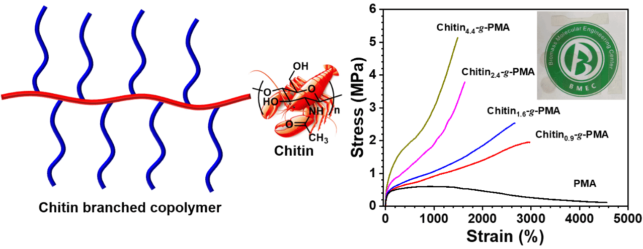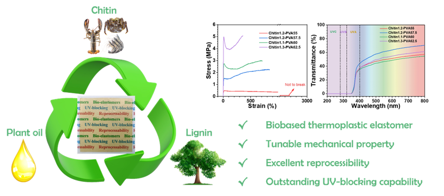 热塑性弹性体是一类具有优异加工性能和延展性的高分子材料,是一种重要的战略物资,在我们的日常生活中有着极其广泛的应用。面对国家的双碳政策和可持续发展战略的重大需求,利用可再生原料开发绿色环保的生物基弹性体具有重要的科学和现实意义,已经成为全球的研究热点。生物基弹性体的开发和应用不仅可以减少对石化资源的过度依赖,还可以避免环境污染,实现热塑性弹性体行业的可持续发展。基于此,团队以甲壳素和纤维素这两种自然界中含量最为丰富的天然多糖,设计了一系列性能优异的生物基弹性体材料。