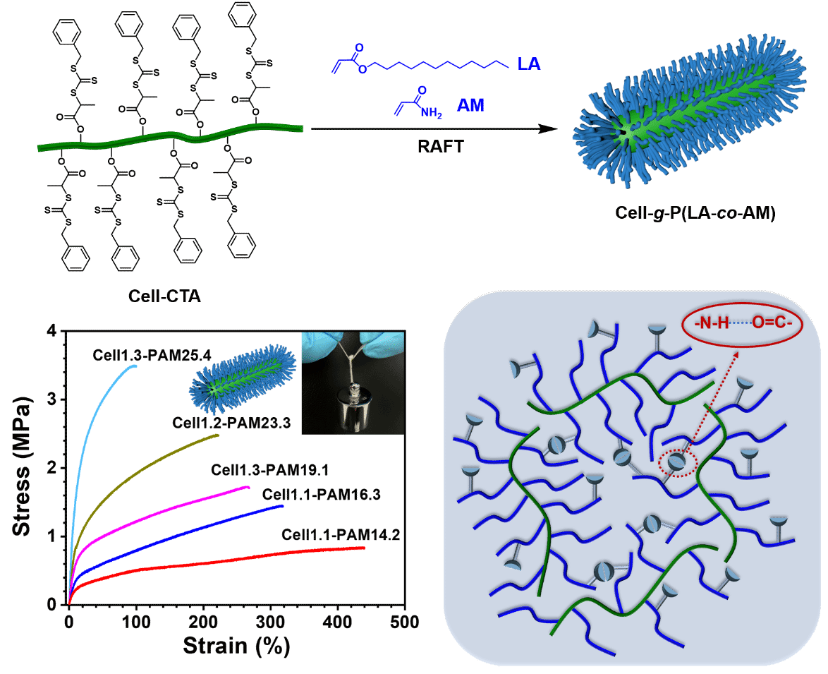 论文3:《结合纤维素以及植物油构筑力学性能可调的可再生瓶刷状弹性体》(Combination of cellulose and plant oil toward sustainable bottlebrush copolymer elastomers with tunable mechanical performance)。yl6809永利检测中心硕士研究生虞汉卿和冯家俊为论文的共同第一作者,蒋峰副教授和汪钟凯教授为论文的共同通讯作者。纤维素作为自然界中储量最为丰富的天然高分子,具有复杂的多手性结构、极好的生物相容性和生物可降解性以及分子结构可设计性等特点,可以在化学改性后作为刚性主链构筑具有刷状结构的生物基弹性体。该研究以纤维素作为刚性骨架,而丙烯酸月桂酯和丙烯酰胺的无规共聚物作为侧链构筑了具有优异力学性能的瓶刷状生物基弹性体。通过调控纤维素刷状弹性体的接枝密度、侧链聚合度、网络结构等方式对性能可以对其性能进一步优化以满足不同的使用需求。这种通用且方便的策略可以促进生物基瓶刷状弹性体的进一步发展。