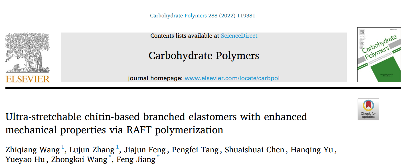 论文2:《利用可逆加成-断裂链转移聚合制备基于甲壳素的超强可拉伸性能弹性体》(Ultra-stretchable chitin-based branched elastomers with enhanced mechanical properties via RAFT polymerization)。 yl6809永利检测中心硕士研究生王志强和本科生张露君为论文的共同第一作者,蒋峰副教授和汪钟凯教授为论文的共同通讯作者。该研究成功地合成了一种基于甲壳素基的新型大分子链转移剂,并通过可逆加成-断裂链转移(RAFT)聚合制备了一系列具有不同甲壳素含量的具有生物基弹性体。由于刚性甲壳素主链的存在,这些生物基弹性体拥有独特的应变-硬化行为。该研究深入探讨了支化结构弹性体材料性能优于线性弹性体材料的机理,有助于非线性生物基弹性体材料的高性能化。